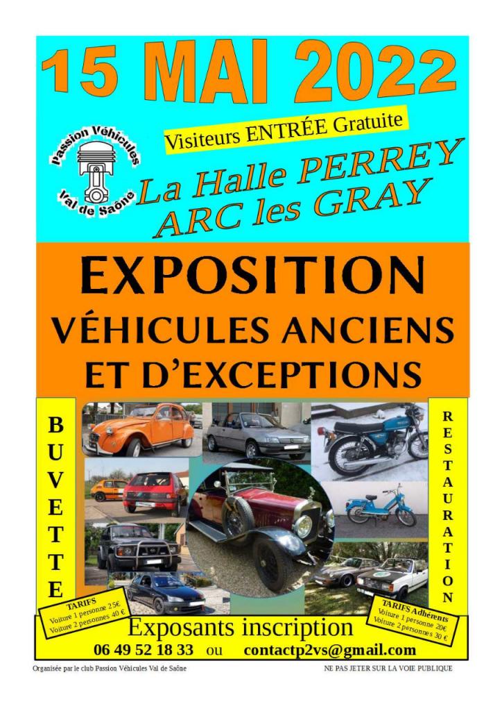 Alors a vos guidons, à vos volant et venz nous retrouver le dimanche 15 mai à la Halle Perrey, tout proche du stade d'arc les grayHoraires: 9H30 - 18HPrix: 25 € 1 voiture avec 1 personne