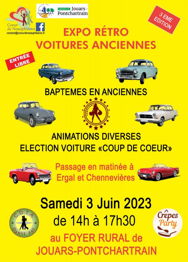 L’Association « CŒUR DE NEAUPHLEENS organise pour la 3ème année une exposition de voitures anciennes. Cet évènement se déroulera le samedi 3 juin au Foyer RURAL de Jouars-Pontchartrain (place du 8 mai).