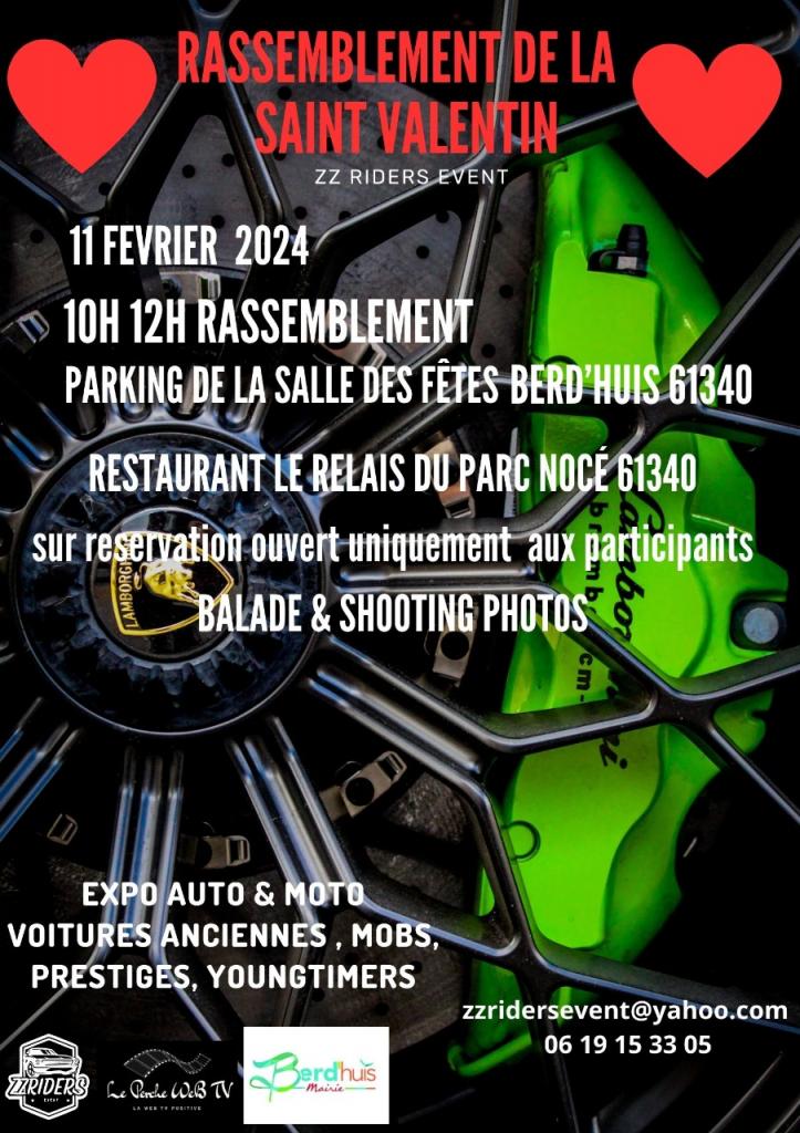 Rassemblement de la Saint-Valentin le 11 février 2024 , le matin de 10h à 12 heures rassemblement à berdhuis (61) a 3 km de Nogent-le-Rotrou , puis le midi sur inscription restauration a Nocé 61 au restaurant le relais du parc , participation de 20,50 € par personne apéro ,plat, dessert , café , puis l'après-midi au départ de Nocé ,balade dans le Perche et shooting photo .