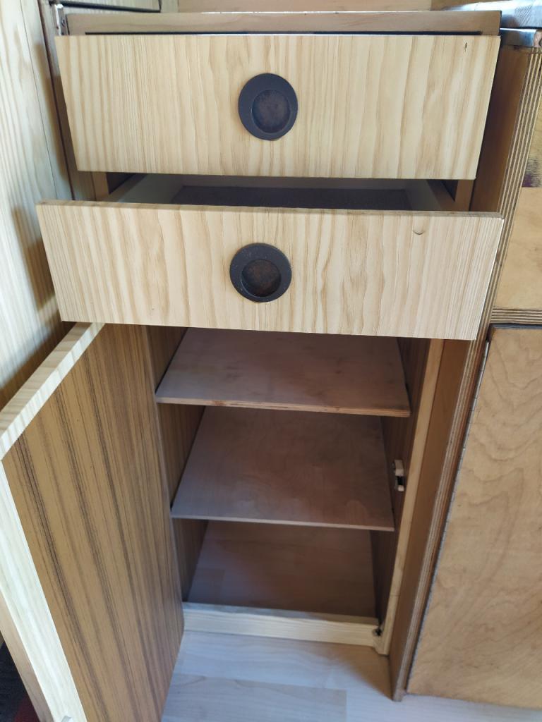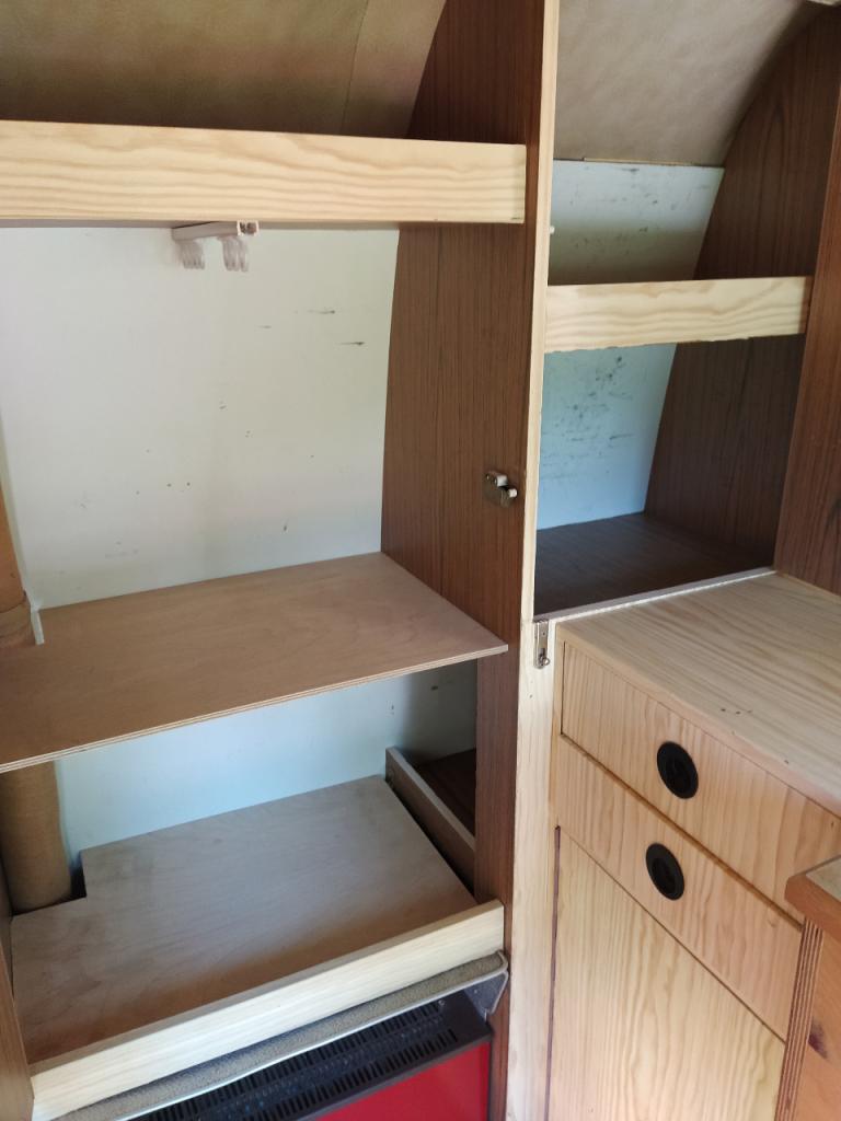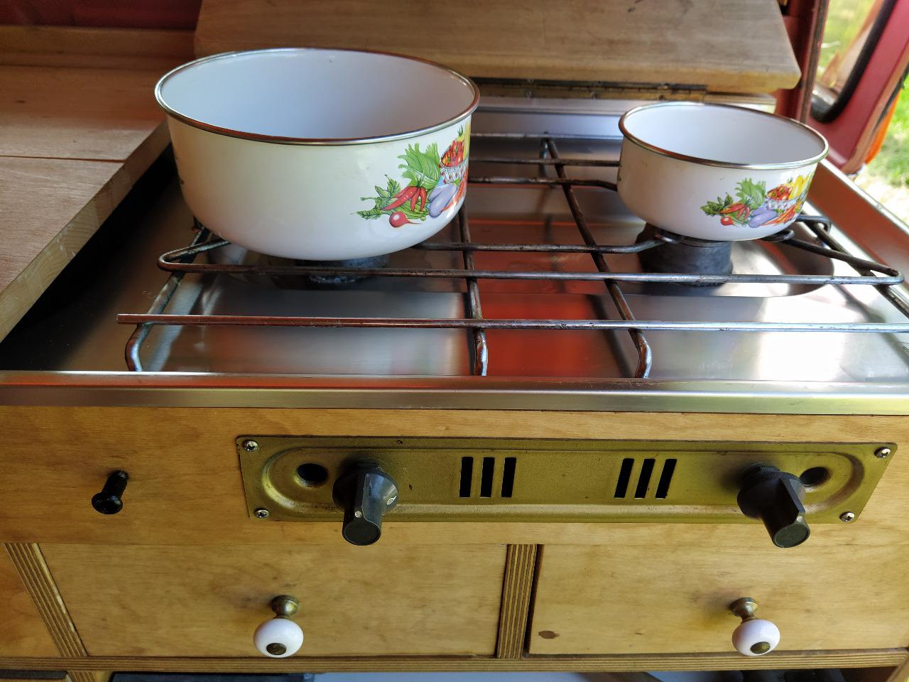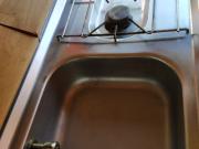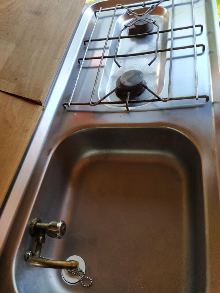 Equipement cuisine avec 2 becs au gaz, évier, réserve d’eau, frigo
