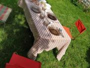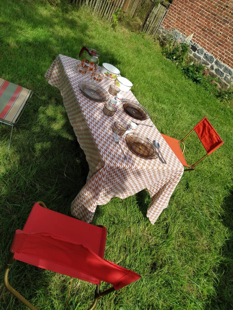 équipement de voyage d’époque: 2 sacs de couchage, vaisselle (assiettes, tasses, casseroles, récipients de conservation, nappe …