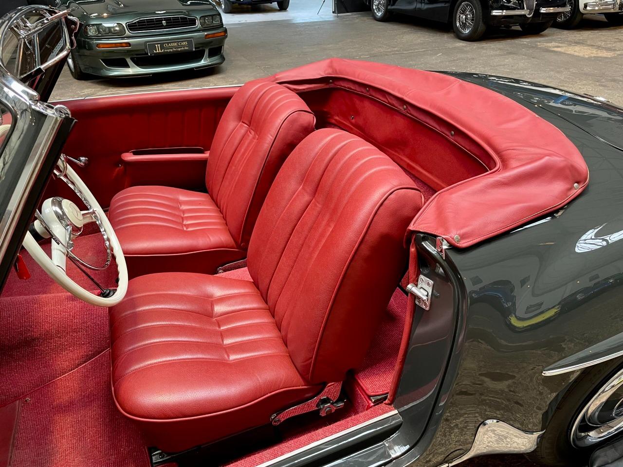 La 190 SL présentée ici est un modèle de 1956, restaurée intégralement à très haut niveau en 2008.