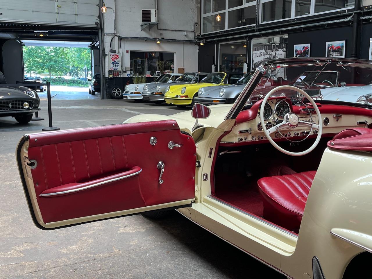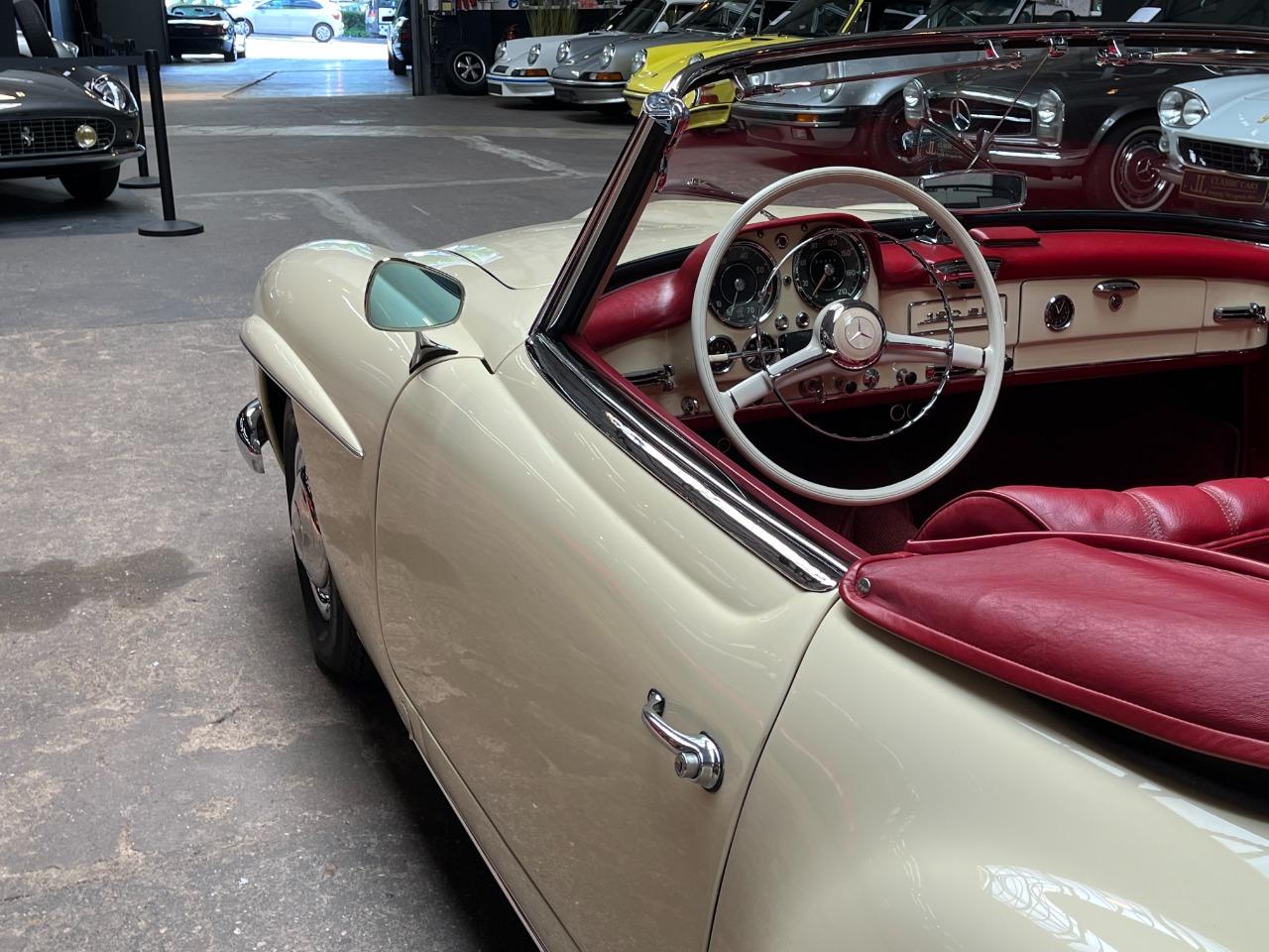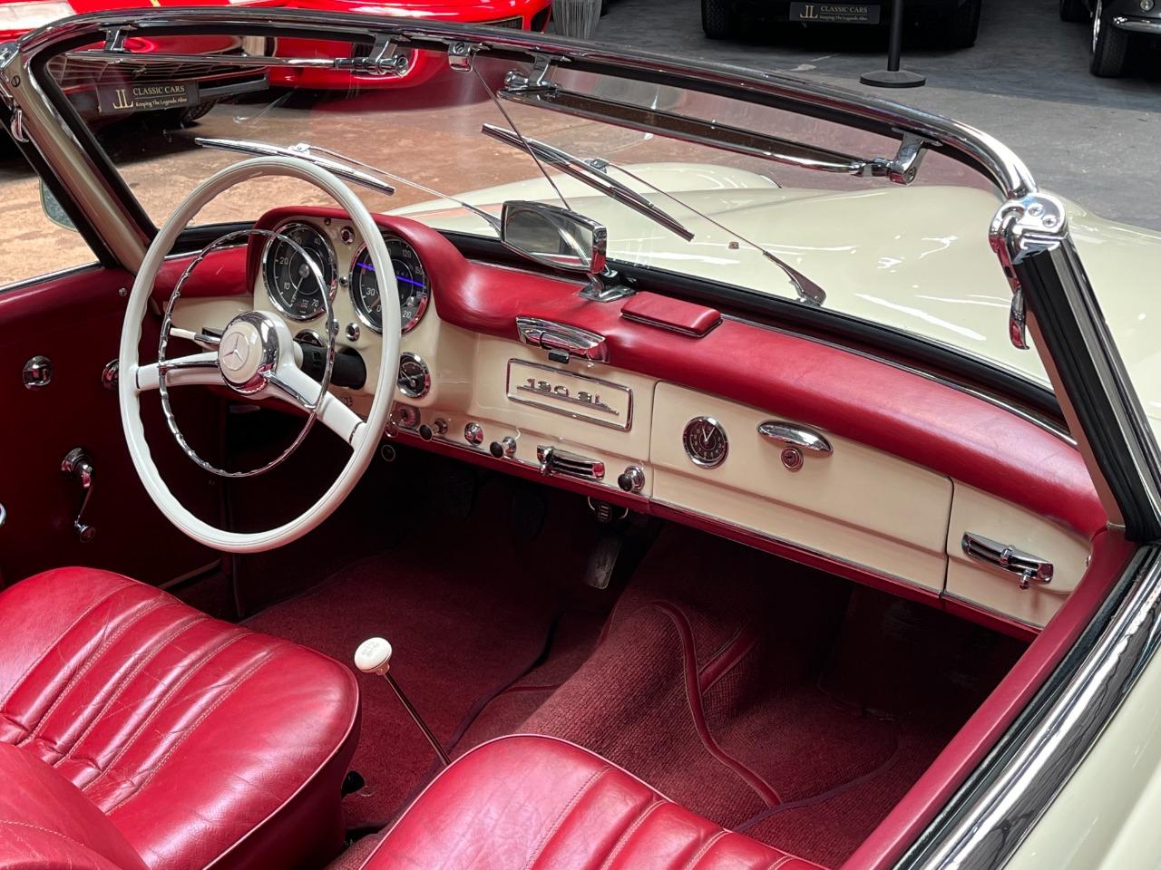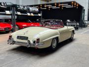 Cette belle Mercedes-Benz 190 SL de 1959 a été la propriété d’un collectionneur de la marque à l’Etoile. Il l’a conservé pendant 44 ans… rien que ça ! La voiture fut restaurée il y a quelques années, tout ceci dans sa configuration d’origine. L’ensemble blanc ivoire avec sellerie rouge est sans doute l’une des combinaisons les plus élégantes pour cette voiture. La sellerie est en très bel état et présente une très légère patine qui lui va à merveille. La mécanique fonctionne bien et elle est fiable. Elle vous emmènera partout avec style et raffinement.