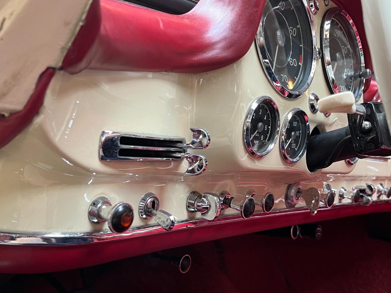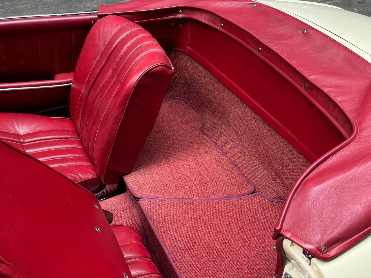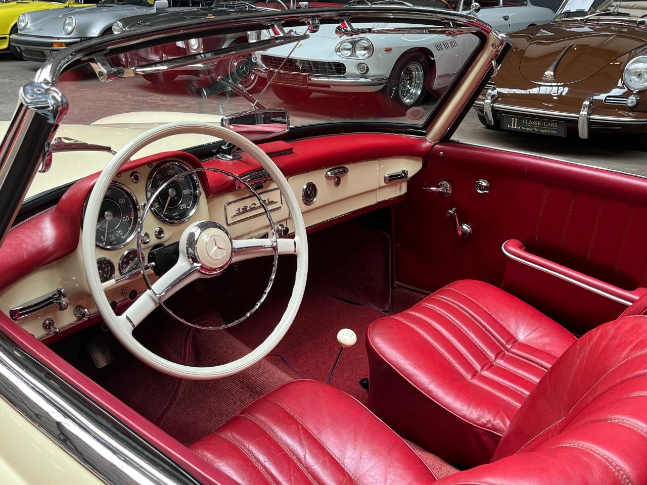 Cette belle Mercedes-Benz 190 SL de 1959 a été la propriété d’un collectionneur de la marque à l’Etoile. Il l’a conservé pendant 44 ans… rien que ça ! La voiture fut restaurée il y a quelques années, tout ceci dans sa configuration d’origine. L’ensemble blanc ivoire avec sellerie rouge est sans doute l’une des combinaisons les plus élégantes pour cette voiture. La sellerie est en très bel état et présente une très légère patine qui lui va à merveille. La mécanique fonctionne bien et elle est fiable. Elle vous emmènera partout avec style et raffinement.