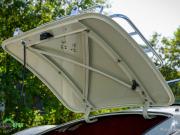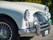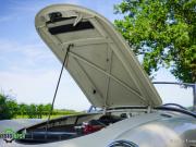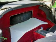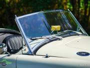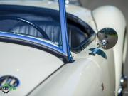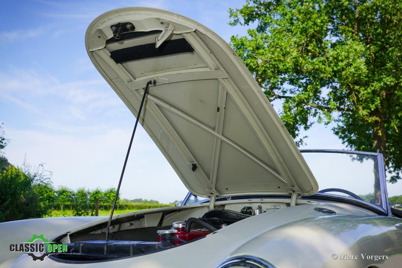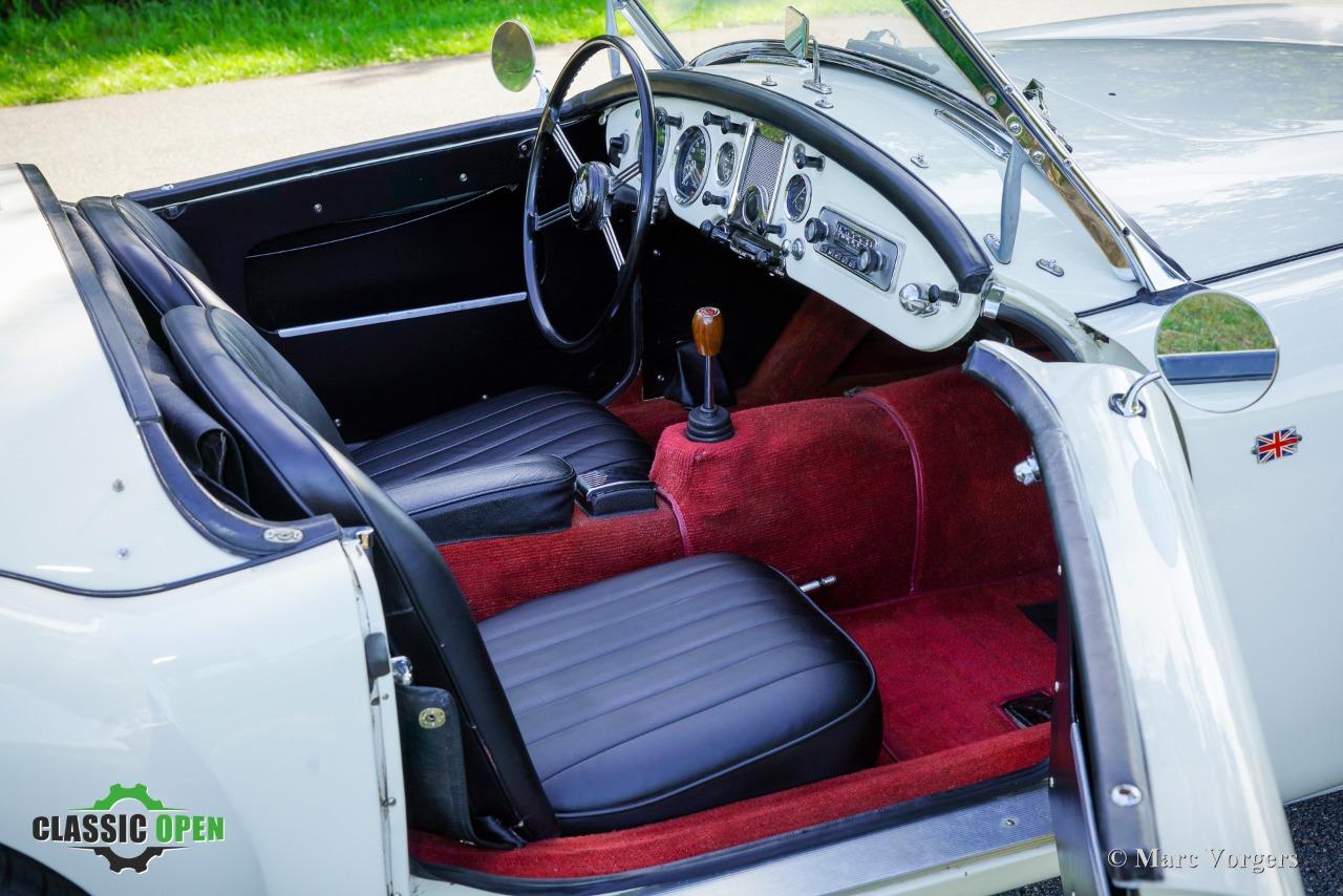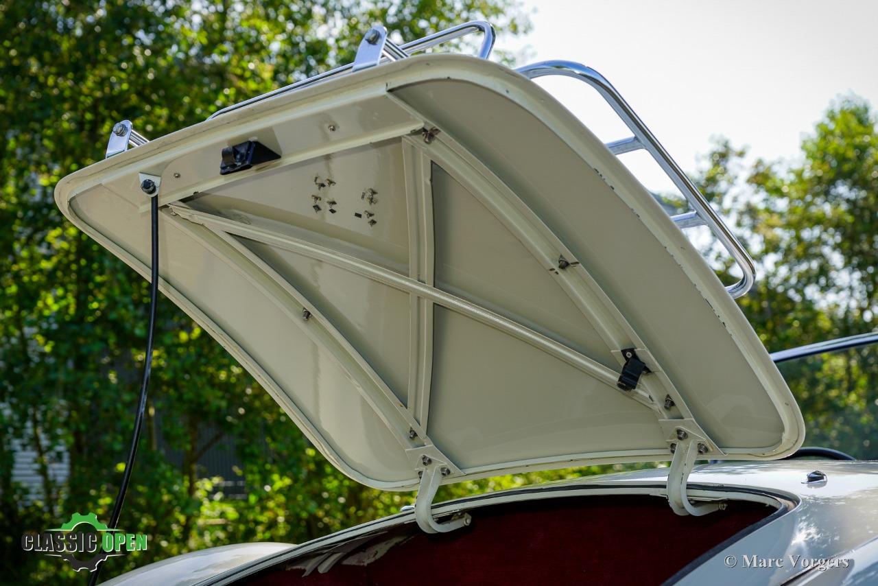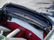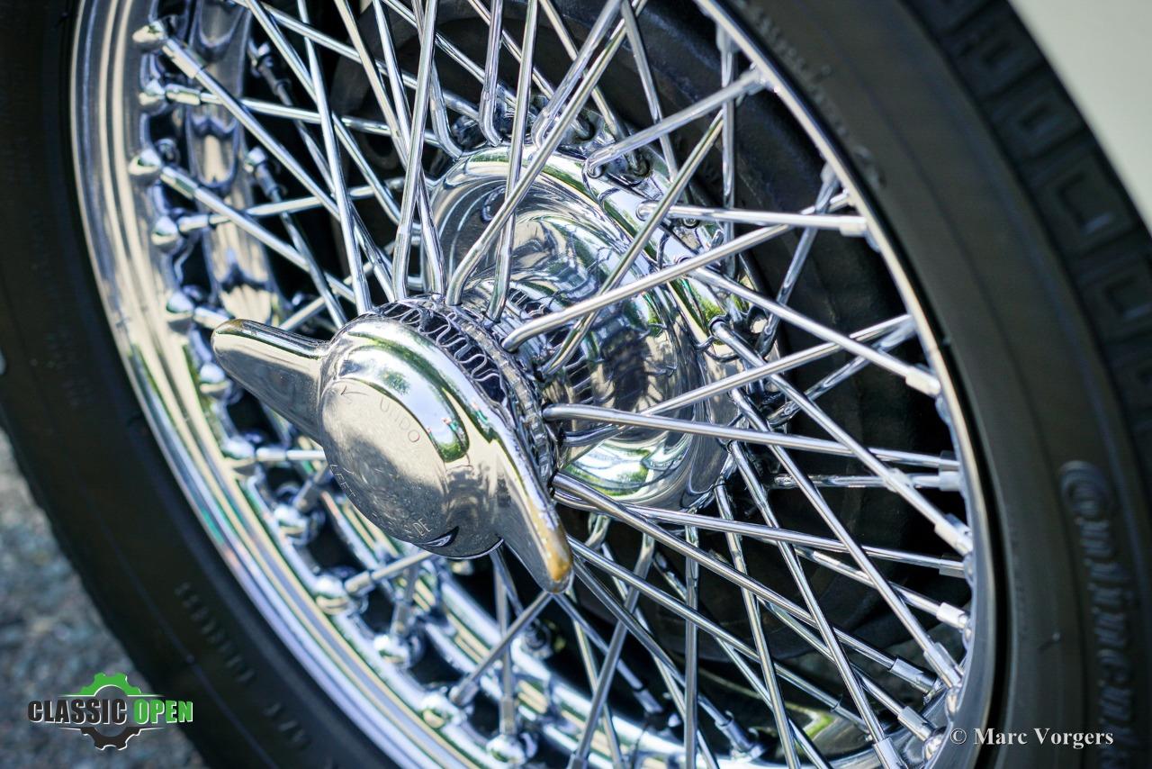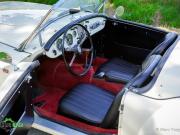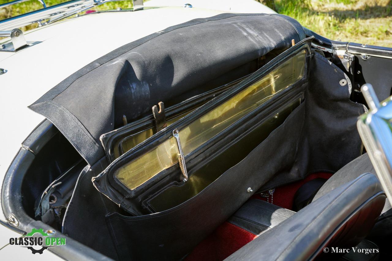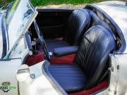 Couleur ‘Old English White’ combinée à un intérieur noir (sièges en cuir noir et garnitures de porte en similicuir) et tapis rouge. Capote et écrans latéraux en vinyle noir.